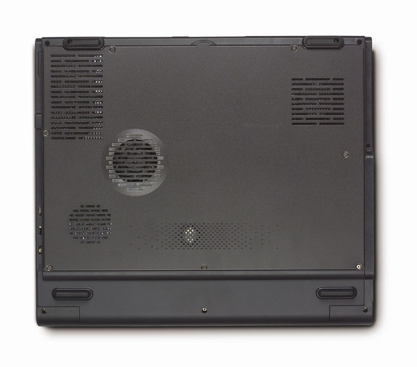 Снизу в передней части ноутбука аккумуляторная батарея, все остальное пространство днища занимает крышка с вентиляционными отверстиями и решеткой низкочастотного динамика.