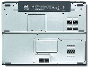 На днище защелки аккумуляторной батареи (на фото сверху) и лючки отсеков плат mini-PCI (по центру) и модулей памяти.