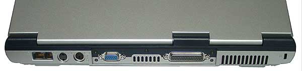 На заднем торце  разъемы, используемые при «стационарном» размещении ноутбука. Слева направо