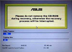 L4H  первая попавшая на наш тест модель ноутбука от ASUS, в комплект которой входит пакет восстановления системы. Естественно, я воспользовался случаем и проверил, как она работает. Надо сказать, система сделана достаточно удачно. Загружаемся с первого диска пакета и попадаем в Startup-меню, где предлагается выбор варианта восстановления (возможно создание на жестком диске двух разделов). После выбора программа пару раз спрашивает, действительно ли мы хотим все восстановить, и предупреждает, что данные будут уничтожены. После получения положительного ответа загружается графическая оболочка и дальнейшие действия пользователя сводятся к замене дисков.