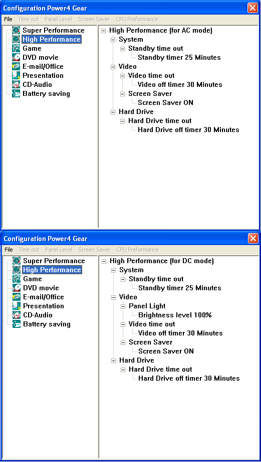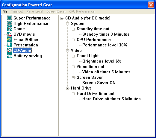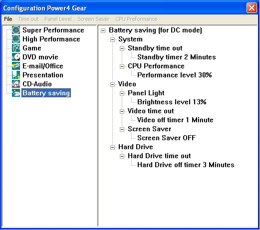 Итак, автономная работа. Режим энергопотребления Portable/Laptop, утилита Power4Gear+ отключена.