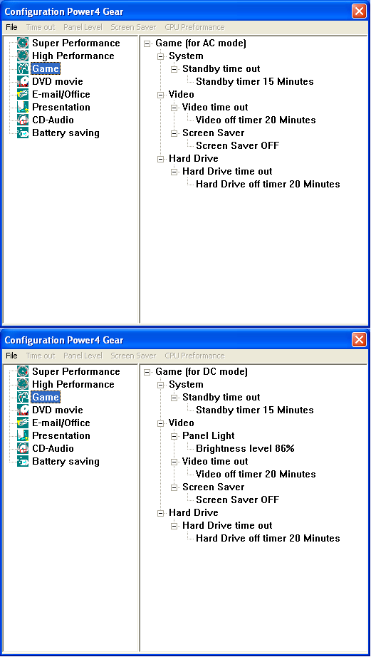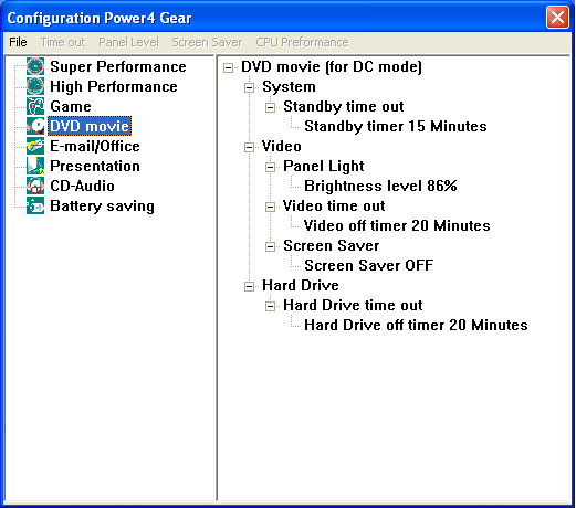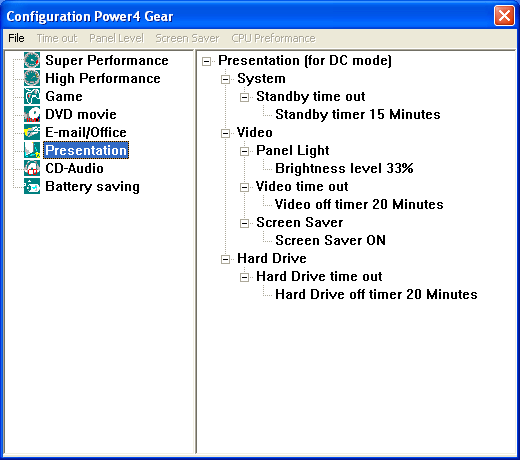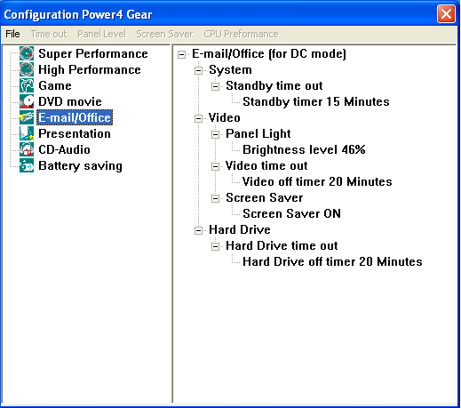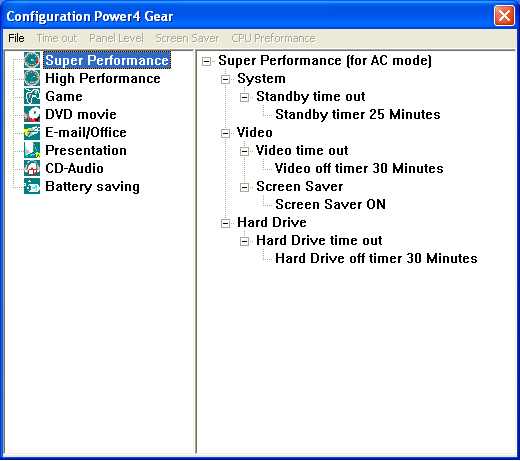 Теперь немного о программном обеспечении. Фирменная утилита управления энергопотреблением от ASUS Power4Gear+ имеет целых восемь предопределенных режимов.