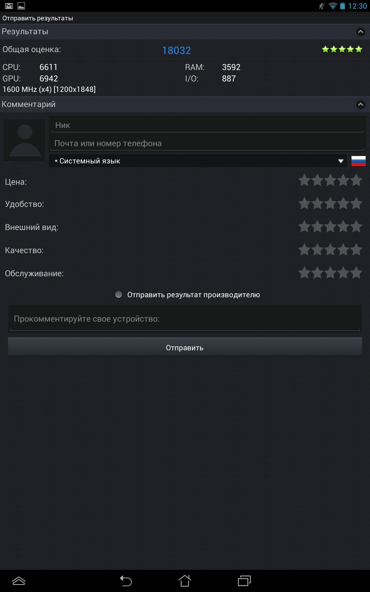 В Quadrant планшет набрал неплохой результат: 6091 балл. И здесь уже наглядно видна разница с Intel Atom Z2460, равно как и с Rockchip 3188 (см. таблицу). Однако новейшая NVIDIA Tegra 4 обгоняет новейший же Atom более чем в два раза.