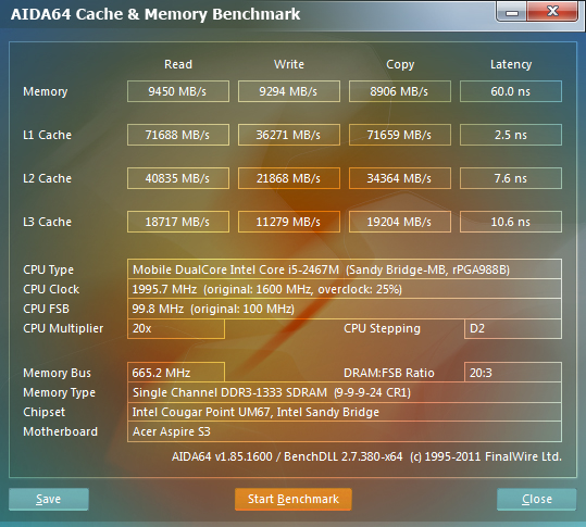 Для сравнения, вот данные Acer Aspire S3, где характеристики немного послабее и память работает в одноканальном режиме.