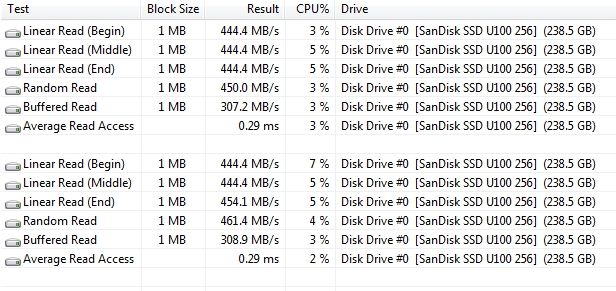Ну и традиционно, данные производительности подсистемы хранения данных. Здесь у нас установлен SSD Sandisk емкостью 256 ГБ.