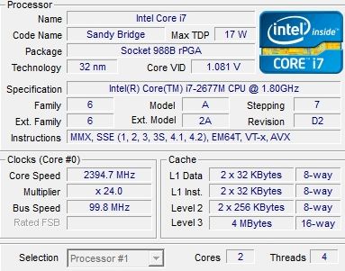 | Процессор | Mobile DualCore Intel Core i7-2677M, 2600 МГц (26×100) | |
