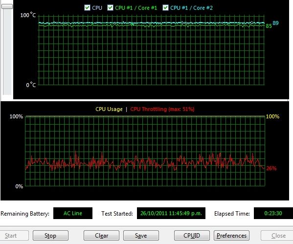 Что, кстати говоря, не так уж и просто. Отображаемая температура что процессора, что ядер оставалась на вполне пристойном уровне. Действительно, именно на этой температуре (особенно в случаях с горячими Core i7 M) Intel Turbo Boost начинает постепенно снижать уровень разгона процессора, чтобы добиться стабильных температурных показателей. В то же время, это не тот уровень, на котором должен начинаться троттлинг процессора, да еще в таких объемах.