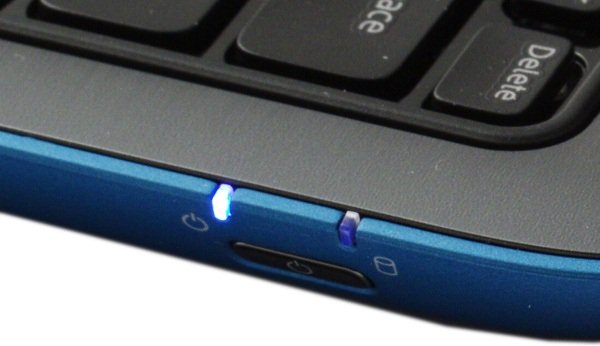 Индикаторов у Inspiron Duo всего два, они расположены над кнопкой питания. Индикаторы светят вверх и вбок (т. е. их видно и при открытой, и при закрытой крышке, но при работе в режиме планшета надо заглядывать сбоку). Индикаторы светят ярко, молочно-белым светом. В темноте немного режут глаза.