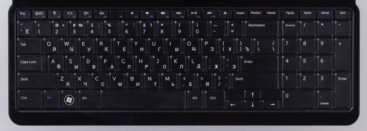 Клавиатура в Dell Studio 1747 поддерживает общее впечатление: она простенькая. Претензий по расположению клавиш у меня не возникло, практически со всеми клавишами можно работать без проблем. Из мелких придирок стоит отметить, что клавиши надкурсорного блока слишком далеко от курсора, ими неудобно пользоваться вместе. Впрочем, чаще всего начинаешь работать с цифровой клавиатурой.