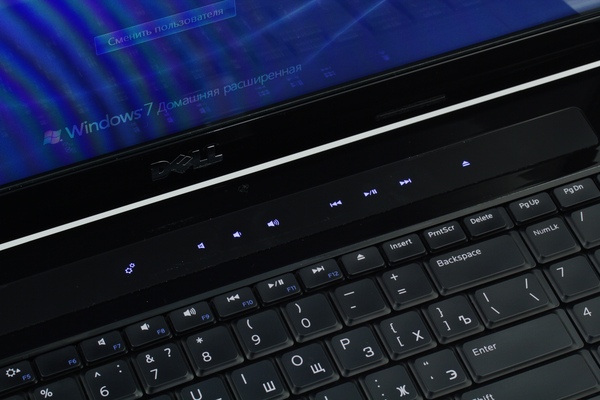У Dell Studio 1747 есть дополнительная секция мультимедийных клавиш. Клавиши сенсорные, при работе они всегда подсвечиваются белым светом. Уровень яркости подсветки, на мой взгляд, хороший, она не слишком режет глаза. Кнопки находятся на специальной матовой вставке, на которой не видно отпечатков пальцев, поэтому ноутбук не будет иметь заляпанного вида.