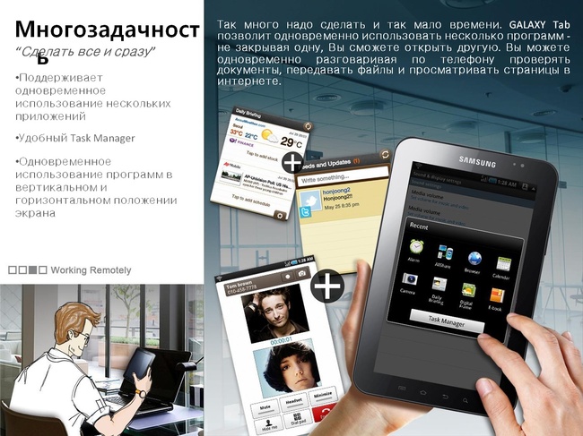 То же, кстати, относится и к общему позиционированию: его одновременно советуют как домашнее мультимедийно-развлекательное устройство, мобильный помощник в дороге… и как инструмент для бизнес-коммуникаций!