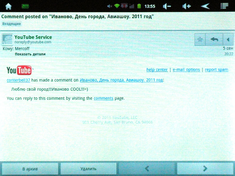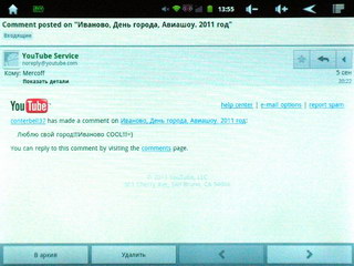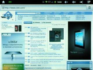 Встроенный браузер быстр в работе, сложное форматирование страниц отображает корректно, скрипты обрабатывает без ошибок. Flash-видео на веб-страницах воспроизводится без задержек, хотя поверх видео всё-таки отображается знакомое многим владельцам Android-устройств предупреждение «Это видео не адаптировано для мобильных устройств».
