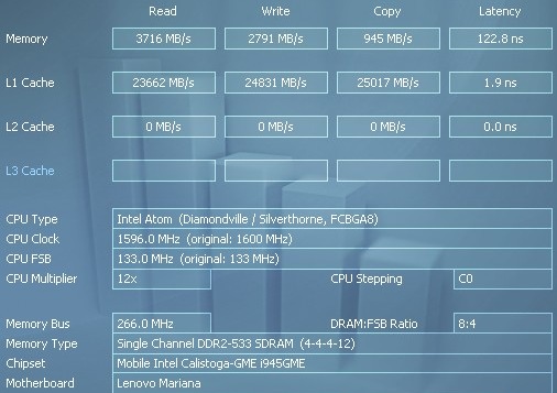 Для сравнения, мы взяли результаты Eee PC. Как видим, производительность процессора такая же (хотя Lenovo везде чуть-чуть быстрее, проиграл только в графике).