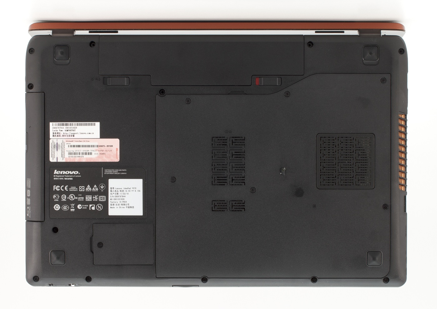 Как видите, на дне ноутбука два лючка для доступа внутрь, один из которых очень большой. Вентиляционные отверстия с характерным для Lenovo рисунком расположены, очевидно, над оперативной памятью и основным вентилятором. Судя по конфигурации системы охлаждения, для ноутбука критично, чтобы он не стоял на мягкой поверхности, перекрывающей решетки.