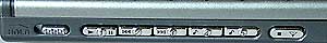 Спереди расположен блок кнопок управления проигрыванием компакт-дисков, они же кнопки быстрого вызова приложений, картовод и аудиоразъемы. Расположение кнопок быстрого вызова на переднем торце непривычно, хотя после привыкания пользоваться ими достаточно удобно. Картовод расположен удобно, а вот расположение аудиовыхода, на мой взгляд, не оптимально. Попробуйте подключить что-нибудь, кроме наушников — провод явно будет мешаться.