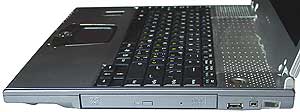 Похожая конструкция верхней крышки применена в модели Samsung X10. Крышка здесь закрывает верхнюю панель не полностью, оставляя на виду блок индикаторов. Ноутбук достаточно тонкий и элегантный, нет ощущения "стандартного кирпича"