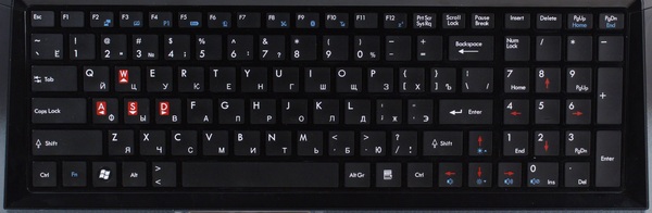 В MSI GX660 установлена клавиатура модного островного типа. Русский и латинский алфавиты нанесены на разные углы клавиш. Символы русского алфавита меньше по размеру, чем латинские, и тоньше, поэтому искать их чуть сложнее, но если не работать в полной темноте, но с ними нет никаких проблем. Традиционно для MSI, клавиши W, A, S, D выделены красным. Считается, что это поддерживает игровой имидж.