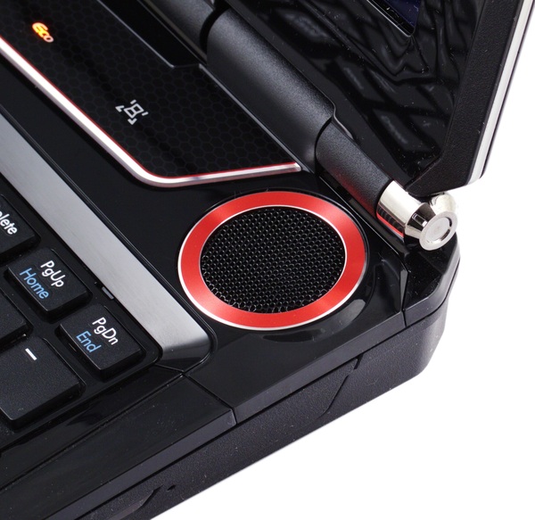 Если говорить о внешнем виде, то первое слово, которое приходит на ум — ярко. Действительно, у GX660 очень много ярких, бросающихся в глаза элементов: серебристая окантовка тачпада, красный бордюр около сенсорных кнопок и красная окантовка динамиков, сенсорные кнопки и кнопка запуска в виде рыцарского щита. Отдельно стоит упомянуть интересное решение рамки вокруг экрана: она сделана из двух панелей, матовой и блестящей, эти части отделяются друг от друга ломаной линией и имеют собственный рельеф. Благодаря этому теряется ощущение, что рамка толстая, и создается очень интересный внешний вид.