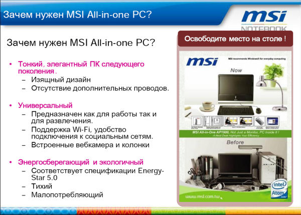 Помимо ноутбуков X-Slim, MSI представила достаточно большую линейку новых для себя устройств, Display или LCD-PC. Эти устройства представляют собой моноблок: весь компьютер собран в корпусе монитора. В принципе, сама по себе идея не нова, время от времени разные производители пытались вывести такие продукты на рынок, однако устойчивого спроса на них не наблюдалось.