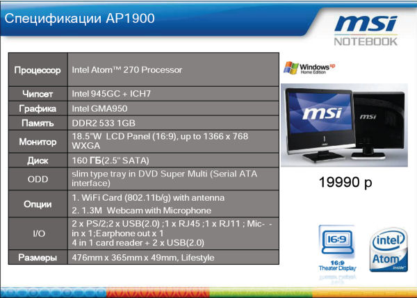 Как видите, модель построена на платформе Atom и имеет достаточно скромные, по текущим меркам, характеристики. В то же время, несмотря на наличие сенсорного экрана, модель имеет более чем демократичную рекомендованную цену.