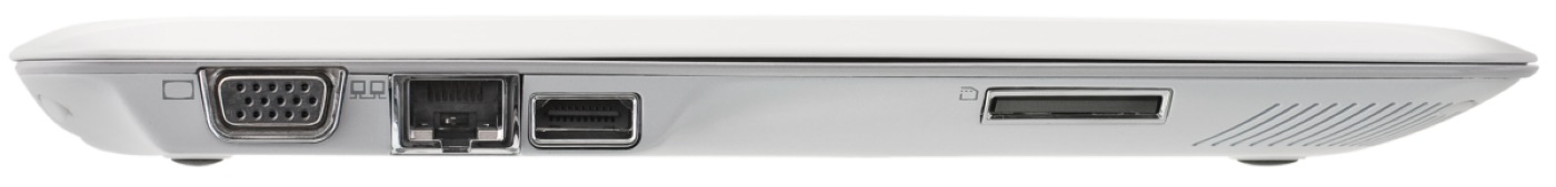 На левой грани расположены: VGA-выход на внешний монитор, разъем для проводной сети RJ-45 и один порт USB. Картовод расположен почти на нижней грани. Чтобы до него добраться, надо чуть ли не перевернуть ноутбук. В картоводе в обычном состоянии вставлена заглушка – чтобы вставить карточку, ее нужно вытащить. Несомненный плюс – карточка утапливается в картовод полностью, то есть можно носить с собой ноутбук с вставленной карточкой, и она не будет ни за что цепляться.