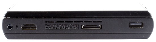 Все разъемы расположены на нижней грани. Левее всего находится аудиоразъем (это обычный штекер 3,5 мм, в него можно вставить наушники или любой кабель). Далее идет HDMI OQO можно подключать монитору или современному телевизору и использовать их как более крупный дисплей, также можно подключить OQO к проектору (HDMI в принципе, та же реализация DVI). Далее, за решеткой вентиляции находится универсальный разъем. В него можно напрямую вставить зарядку, а можно специальный порт расширения: на нем есть такой же разъем (в который вставляется зарядка), а также аналоговый выход VGA на внешний монитор и разъем для проводной сети. Наконец, в правой части находится порт USB. Очевидно, что при постоянном использовании один порт это очень мало, если подключать внешние устройства. Например, вставил флэшку и привет. Если вы хотите использовать внешнюю клавиатуру и мышь, то нужно обязательно иметь USB-хаб или пользоваться беспроводной техникой с поддержкой Bluetooth. Впрочем, это мелочи, т.к. OQO не может самостоятельно стоять на столе под удобным углом, т.е. его либо надо ставить на подставку (или док-станцию), или подключать и монитор, и периферию, тогда необходимость использования хаба уже непринципиальна (или использовать порты на доке).
