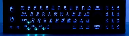 Подсветка клавиш сделана как в телефонах яркие синие диоды светят через прозрачные контуры букв. В варианте с английской клавиатурой все просто отлично: четкие символы, буквы отлично читаются, организация подсветки на высоте: пользоваться можно без проблем. Подсвечиваются и латинские, и русские символы.
