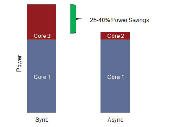 Кроме того, в случае aSMP любое вычислительное ядро, которое не используется в данный момент времени, можно полностью отключить. По оценкам Qualcomm, всё это обеспечивает прирост в энергоэффективности на 25-40% по сравнению с синхронными архитектурами, а также упрощает чип — ведь в таком случае отпадает необходимость в дополнительных вспомогательных ядрах, работающих на меньшей частоте (как в архитектуре NVIDIA Tegra 3, названной 4-Plus-1, или аналогичной архитектуре big.LITTLE компании ARM).