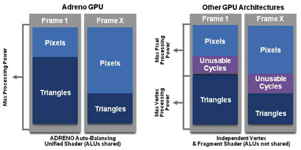 В целом, архитектурно модели Adreno 225 и 220 почти одинаковы и относятся к унифицированным графическим архитектурам класса DirectX 9. Унификация вычислительных блоков на практике означает то, что все программы (вершинные, пиксельные и другие) выполняются на одних и тех же функциональных устройствах. Выполнение вершинных и пиксельных шейдеров универсальными исполнительными блоками повышает эффективность GPU в целом, так как эти блоки не простаивают в случае большей загрузки пиксельной или вершинной работой: