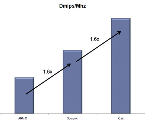 В случае Cortex-A15 точные данные ARM пока что неизвестны, но по неофициальным данным показатель DMIPS/МГц у Cortex-A15 несколько выше, чем у Krait — более 3,5. Но устройства на базе Cortex-A15 появились на рынке заметно позже, чем те, что используют Krait. Рассматривая только ядра, которые производила компания Qualcomm (чипы на базе ARM11 они делали до реализации Scorpion), можно увидеть, что прирост целочисленной производительности в каждом поколении был равен 60%.