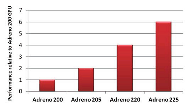 В Adreno 225 были сделаны изменения для увеличения производительности. Во-первых, если Adreno 220 работает на частоте лишь 266 МГц, то Adreno 225 имеет рабочую частоту уже 400 МГц. Во-вторых, Qualcomm сделала некие программные улучшения в драйверах Adreno 225 — видимо, увеличивающие эффективность компиляции. Всё это позволяет специалистам Qualcomm говорить об ускорении в 50% по сравнению с Adreno 220.