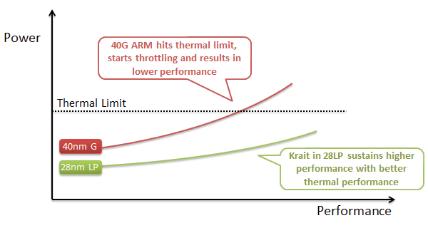 У указанных компаний несколько разный подход к проектированию систем-на-чипах. Qualcomm полагает, что «LP»-техпроцесс в целом лучше подходит для мобильных устройств, так как большую часть времени мобильные чипы работают на невысокой частоте, а «G»-транзисторы помогают снизить утечки лишь при высоких частотах и напряжениях. По мнению компании, «LP» обеспечивает более выгодные характеристики энергоэффективности, когда «G» достигает предела по тепловыделению: