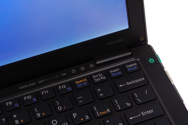 Индикатор работы у VAIO Х встроен в клавишу питания, при работе он горит зеленым светом, в ждущем режиме мигает красным, как на других ноутбуках Sony. Здесь применено интересное решение: горит зеленым символ включения (он направлен вверх) и полоска сбоку кнопки, которая выходит на боковую грань по ней видно состояние ноутбука при закрытой крышке. Индикаторы состояния батареи, активности жесткого диска и беспроводных интерфейсов вынесены на переднюю панель, под тачпад. В принципе, если смотреть специально, их видно и при работе, но краем глаза не всегда замечаешь. Индикаторы клавиатурных модификаторов расположены над клавиатурой. Диоды во всех индикаторах слабые, их видно, если смотреть прямо на них, но они не отвлекают от работы даже в темноте. Если ноутбук включен в полутьме (например, при просмотре презентации или видеоролика), то ярко будет светиться только кнопка питания.