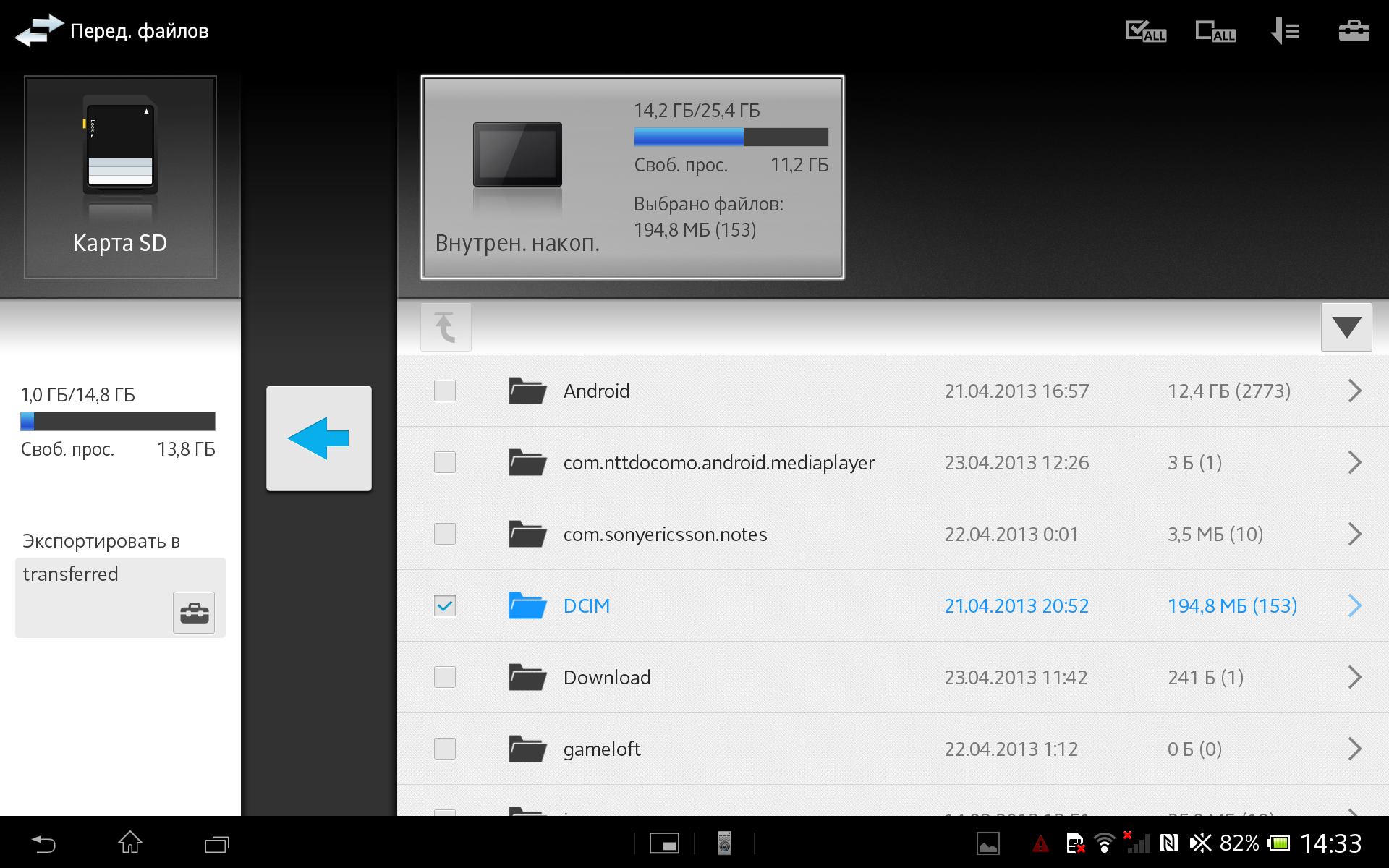 Набор предустановленных на планшете приложений в целом стандартен, если не считать приложений «японского» происхождения и вышеупомянутого Дист.управление, а также Менеджера файлов. Последний нас очень порадовал своим интерфейсом. Вот как в нем реализовано, например, копирование файлов между внешним носителем и встроенной флэш-памятью устройства.