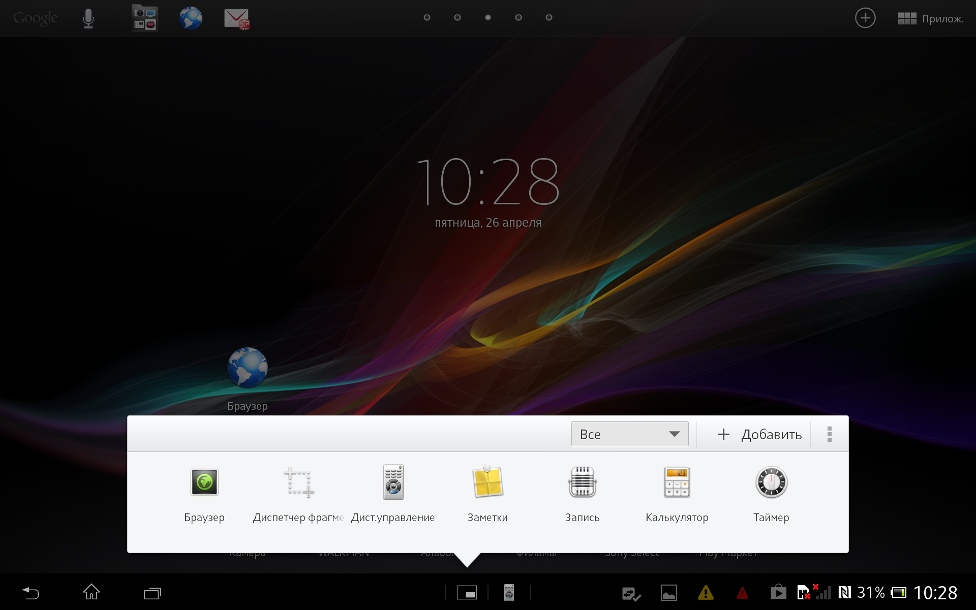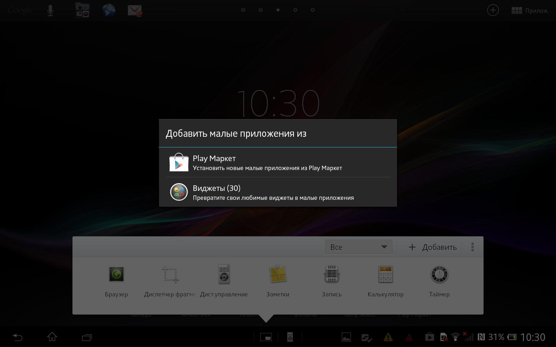 Пользователь планшета может добавлять новые мини-приложения. Существует два источника: во-первых, в мини-приложение можно преобразовать виджет (для этого достаточно нажать на кнопку Добавить на панели мини-приложений, выбрать Виджеты и указать один из имеющихся виджетов).