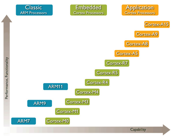 Процессоры архитектуры ARMv5 и ARMv4 до сих пор используются в не очень сложных устройствах, так как позволяют обойтись меньшими затратами за лицензии. Процессоры ARMv6 значительно производительнее, но уже существуют и процессоры семейства ARMv7, также известные как Cortex. Они отличаются ещё большей скоростью и энергоэффективностью и делятся на подвиды: Cortex-A применяется в смартфонах, Cortex-R созданы для приложений реального времени, а Cortex-M — для микроконтроллеров. Вот как они отличаются по возможностям и производительности (схематично):