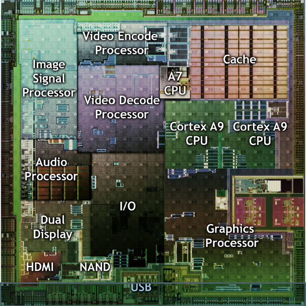 На примере Tegra 2 хорошо видно, что SoC состоят из нескольких блоков, каждый из которых предполагает выполнение сравнительно узкоспециализированной, требующей вычислительных ресурсов, задачи. Именно поэтому система на чипе может обеспечить выполнение сравнительно сложных задач, с которыми плохо справлялись даже мощные центральные процессоры не такого давнего прошлого.