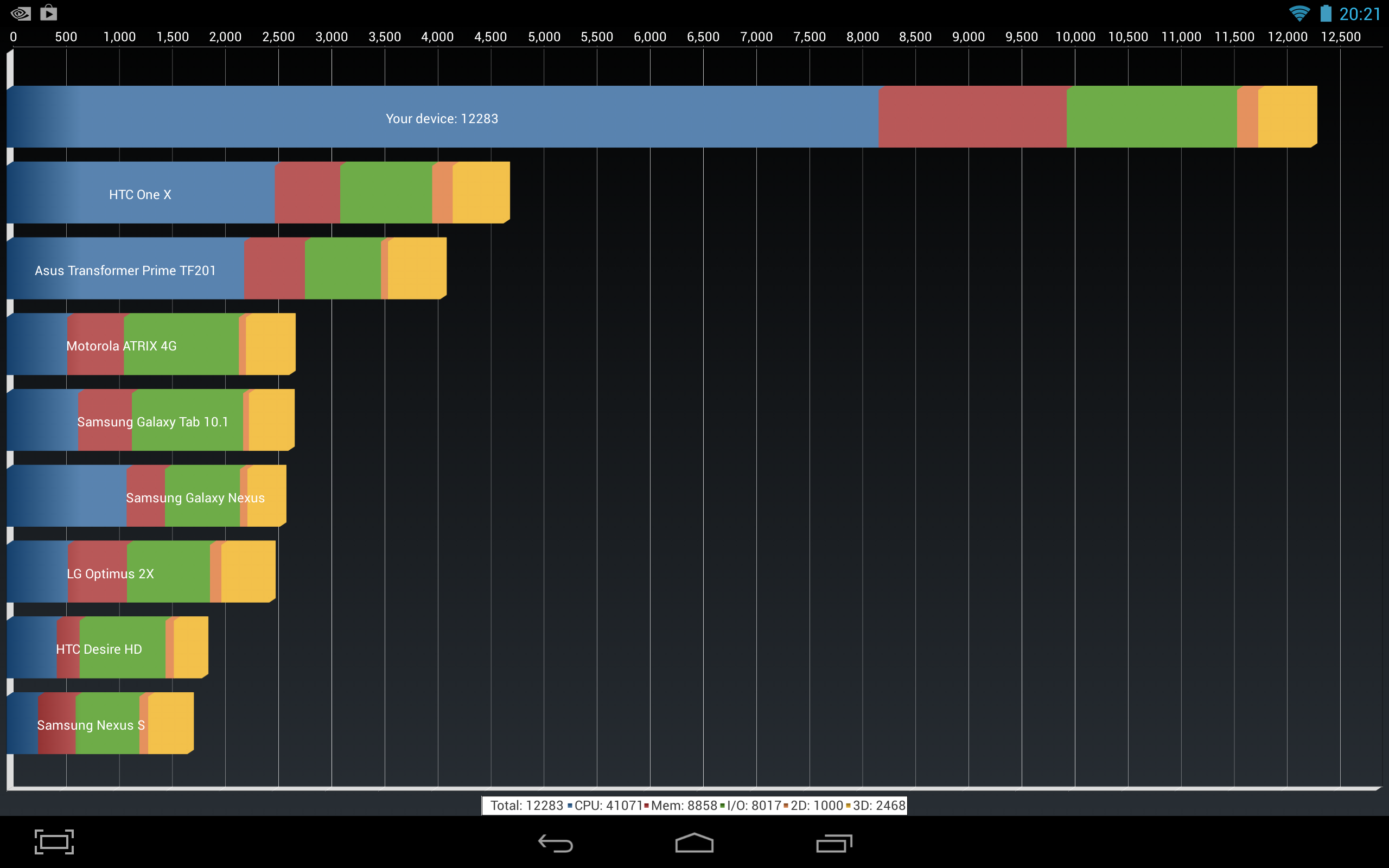 В AnTuTu Benchmark ситуация аналогичная. Главное отличие результатов комплексных бенчмарков от браузерных — в том, что здесь NVIDIA Tegra 3 в отстающих, а в браузерных эта SoC, наоборот, обгоняла большинство конкурентов, однозначно отставая только от NvIDIA Tegra 4. Но тут не стоит забывать про объем оперативной памяти: у ASUS Transformer Pad Infinity ее только 1 ГБ, тогда как у остальных планшетов из таблицы выше — 2 ГБ.