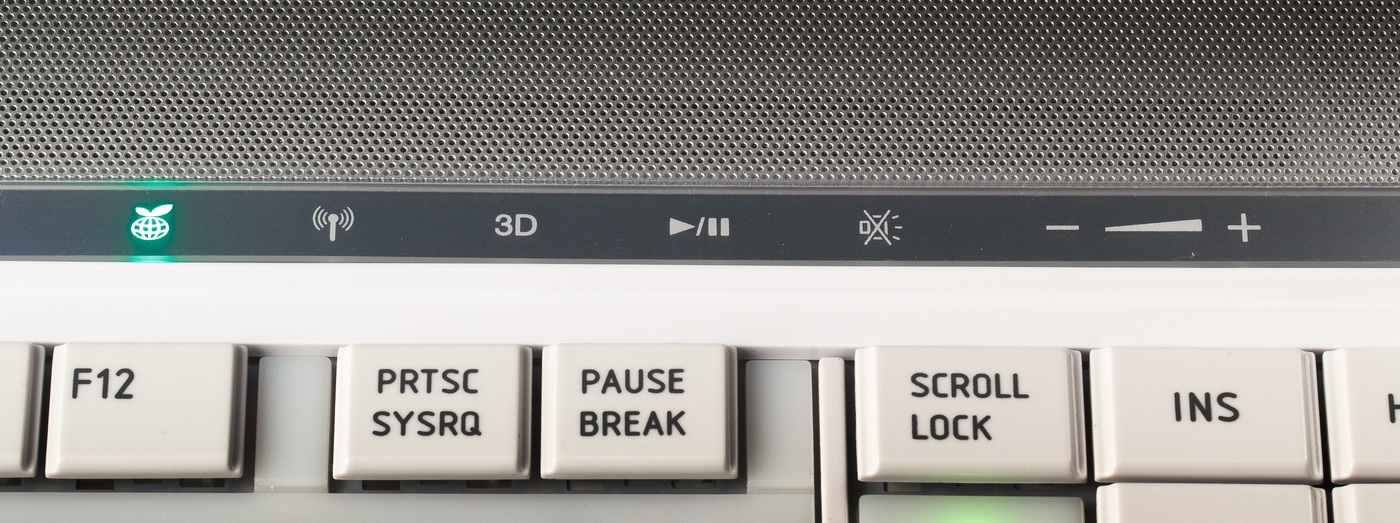 Во-вторых, обратите вниманием на подъемы в корпусе с боков от центральной петли, на которой держится экран. Это не просто элементы петельного узла. Давным-давно в легендарных моделях серии 5100, 5200, выдающихся для своего времени ноутбуках, в этих местах располагались динамики Harman Kardon (наверное, это были одни из первых ноутбуков на рынке со столь хорошей акустикой. Впрочем, там еще очень много крайне интересных эргономических решений). Установленные таким образом динамики смотрели на пользователя, что позволяло получить очень хороший, четкий и детальный звук. Как видите, сейчас эти выступы остались, однако динамики «переехали» в более распространенное место: они установлены в панели над клавиатурой и смотрят вверх. В таком положении качество звука всегда будет чуть хуже, т. к. динамики не смотрят на пользователя.