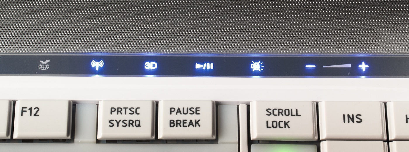 Наконец, справа расположены три клавиши регулировки звука. И если с отключением все понятно, то вот регулировка неудобная — во-первых, чтобы сильно поднять уровень, надо долго держать палец на кнопке. А во-вторых, и это самое главное — каждую ступень регулировки ноутбук отмечает громким и очень неприятным писком (т. к. обратной связи у сенсорных кнопок нет, и иначе понять, что клавиша сработала, невозможно). Так что пару раз подняв/понизив громкость, вырабатываешь у себя стойкую привычку пользоваться для ее регулировки какими-нибудь другими средствами. А жаль. Раньше у Toshiba было такое удобное колесико регулировки громкости!..
