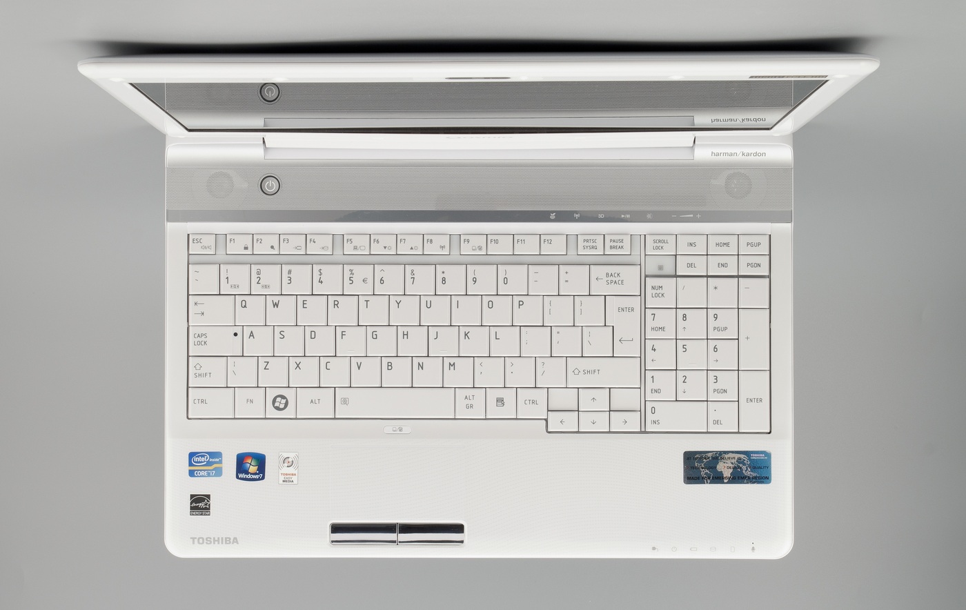 Раскладка клавиатуры у Toshiba серии Qosmio тоже не меняется уже в течение достаточно длительного времени. В этом варианте клавиатуры Toshiba — необычные, очень большие клавиши, расположенные впритык, что обычно немного повышает количество опечаток. Плюс, они немного «шевелятся» на своих местах вправо-влево — это создает ощущение неуверенности.