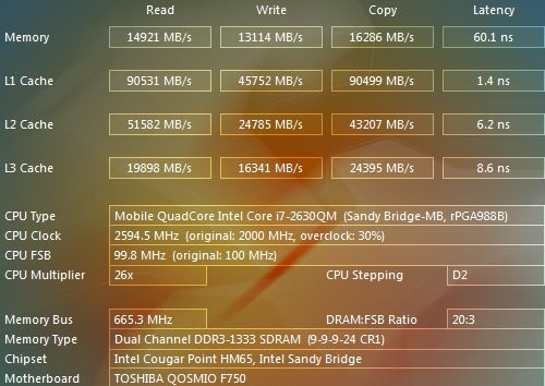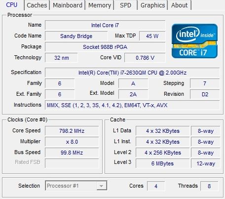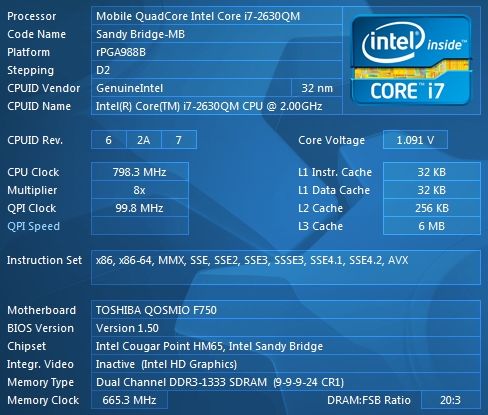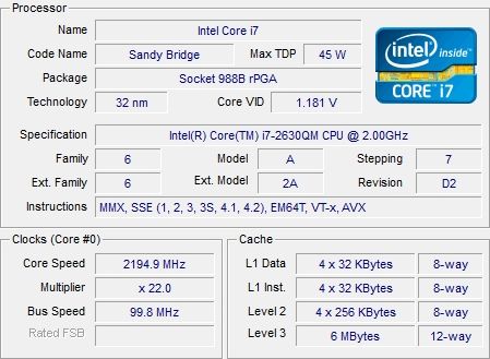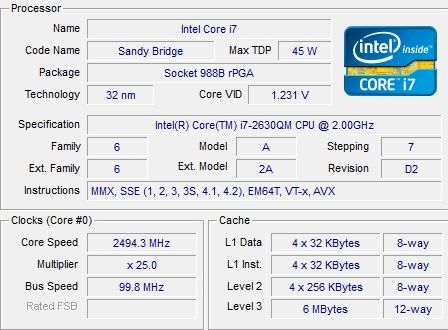 | Процессор | Mobile QuadCore Intel Core i7-2630QM, 2600 МГц (26×100) | |