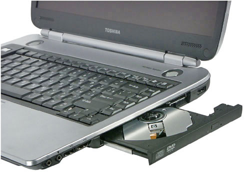 Итак, для начала давайте рассмотрим расположение разъемов. На передней панели не так уж много портов: ИК порт (вот уж чего вполне можно было бы избежать), механический выключатель беспроводной связи, традиционный для Toshiba регулятор громкости в виде колесика, да вынесенные на торец кнопки управления аудиоплеером. Тут нужно отметить, что передняя панель скошена к низу почти под 45 градусов, поэтому пользоваться, например, регулировкой громкости очень и очень неудобно — более-менее толстый палец элементарно застревает между поверхностью стола и скосом, и не достает до регулировки.