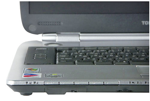 М30 имеет три традиционных дополнительных клавиши — запуск Интернет-обозревателя, утилиты управления Toshiba console и быстрого включения вывода изображения на внешний монитор. А также 4 индикатора, светящихся синим (верхний ряд) и желтым (нижний) светом. В кнопку питания встроен светодиод, горящий ярко-синим при работе ноутбука. Решение, надо сказать, привлекающее взгляд, но не очень продуманное, так как ночью светящийся светодиод слишком яркий и отвлекает от экрана.