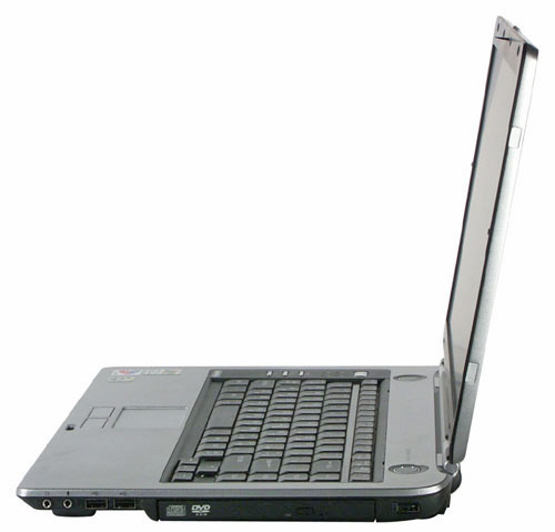 Середина задней панели занята батареей, но ноутбук-то широкоформатный, поэтому полностью занять панель не удалось — осталось место и для портов. И на заднюю панель унесли разъем питания и сдвоенные разъемы модема и сети. Я абсолютно согласен с таким размещением, эти кабели чаще всего торчат из ноутбука и портят внешний вид.
