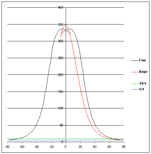 Зависимость контрастности (отношения яркости белого поля к яркости черного) в центре экрана от отклонения оси датчика (отрицательные значения — влево или вниз, положительные значения — вправо или вверх) от нормали к экрану в вертикальной и горизонтальной плоскостях. Зеленая линия — отношение 10:1, голубая — 5:1