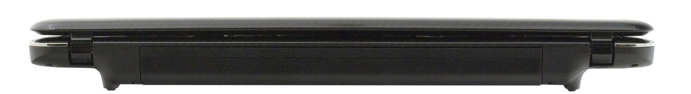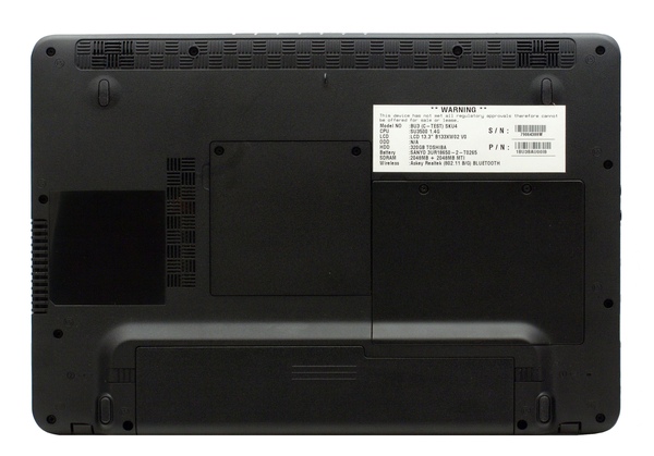 Дно ноутбука сделано из черной шероховатой пластмассы, которая выглядит простенько и непритязательно. Из этой же пластмассы сделана большая часть боковых граней, от лаковой клавиатурной панели они отделяются серебристым молдингом. Обратите внимание, как выполнены решетки вентиляции на дне. Они здорово придают ноутбуку оригинальности и частично компенсируют впечатление от материалов дна.