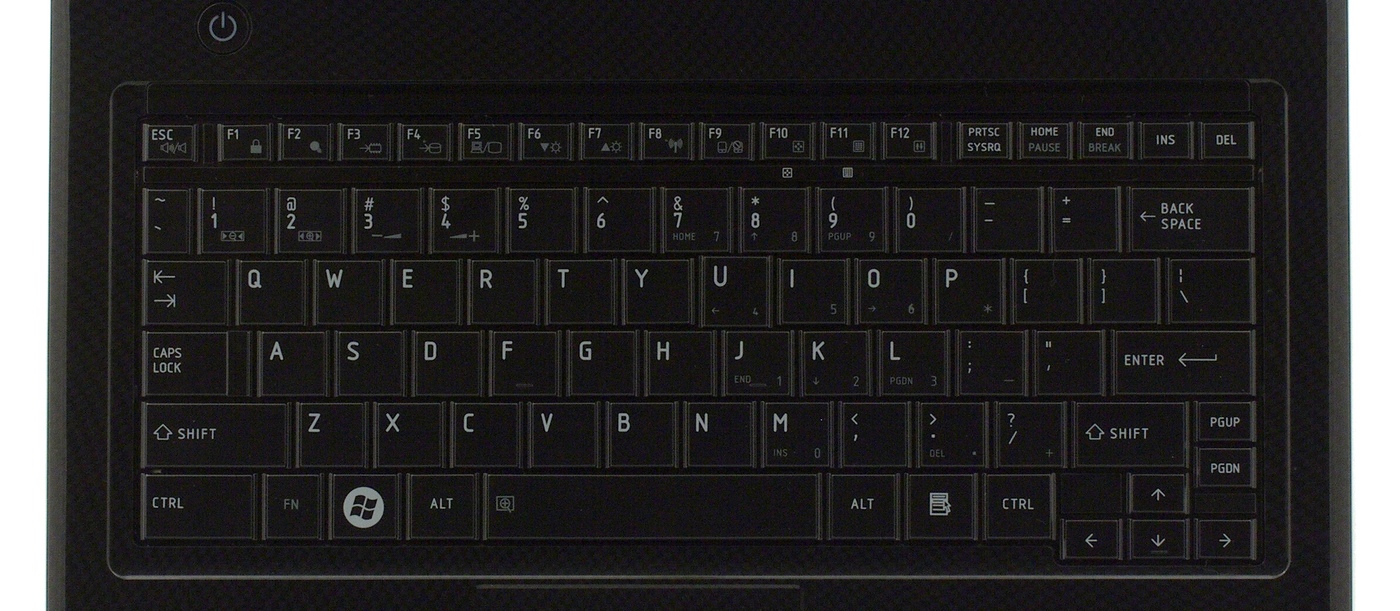 В этой модели нет дополнительных клавиш. Те дополнительные функции, управление которыми возможно, реализованы как сочетания с клавишей Fn. Обратите внимание, что этих функций достаточно много. Здесь можно: заблокировать компьютер (выводится стандартная заставка для ввода пароля), переключиться между схемами питания (нормальная и экономия энергии по умолчанию), перевести компьютер в сон или гибернацию (и то, и то реализовано клавиатурными сочетаниями, это чрезвычайно удобно при повседневной работе), можно также отрегулировать яркость экрана, включить или выключить беспроводную сеть, включить или выключить встроенный тачпад, включить клавиатурные модификаторы (Num, Scroll Lock).