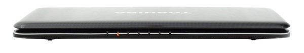 Всего на передней грани восемь индикаторов. Слева направо: индикатор подключения к сети: горит зеленым, когда ноутбук подключен в розетку. Индикатор включения: горит зеленым при работе, мигает в спящем режиме. Индикатор батареи: горит красным, когда батарея заряжается, зеленым когда заряжена. При работе от батареи индикатор не горит. Далее идет индикатор обращения к жесткому диску, индикатор обращения к карте памяти и два индикатора, связанных с беспроводной сетью.
