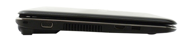 На левой грани расположены порт замка Кенсингтона, аналоговый выход VGA на внешний монитор, решетка вентиляции, далее идут разъемы HDMI и USB.